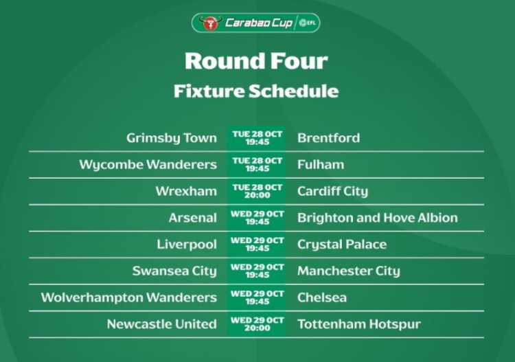 聯賽杯第4輪:阿森納對陣布萊頓和利物浦迎戰水晶宮比賽將於10月30日淩晨三時四十五分展開
