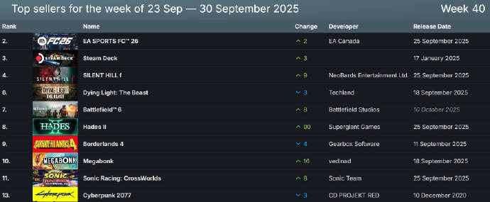 Steam銷量排行榜:EA SPORTS FC 26勇奪冠軍 寂靜嶺f穩居第三名