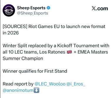 外媒報道明年LEC賽制調整 歐洲大師賽冠軍將獲得晉級資格 共計12支戰隊參與