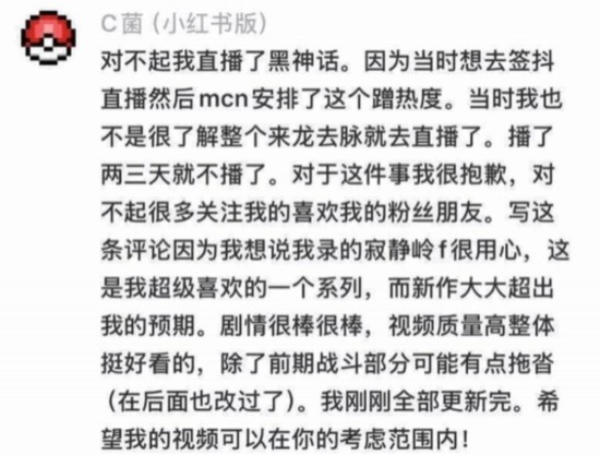 在这段时光里,他忙于录制《寂静岭f》,面临巨大的压力,同时也对视频的观众反馈十分在意。他希望能将最好的作品献给喜爱《寂静岭》的玩家,因此对那些因他过往行为而抵制新视频的评论感到心痛。他表示,正因为这样的情绪驱动,他才选择发出那条道歉评论。
